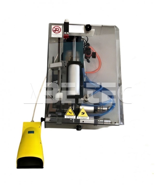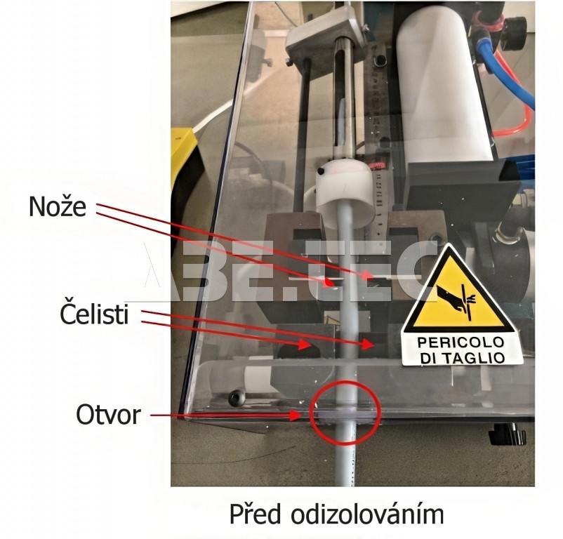 Jakmile je stroj nastaven s vhodnými noži a je zaznamenán zdvih pneumatických válců, stačí pro dosažení poloviční nebo úplné délky odizolování provléknout kabel otvorem v krytu a poté jej protáhnout čelistmi a noži, dokud nedosáhnete požadované délky odizolování.