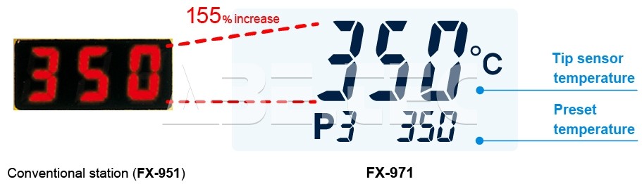 Digitální displej jasně a podrobně zobrazuje informace, jako je nastavená teplota, teplota senzoru hrotu a přednastavené hodnoty. Pozorovací úhel je široký a displej s vysokým jasem poskytuje vysokou viditelnost.