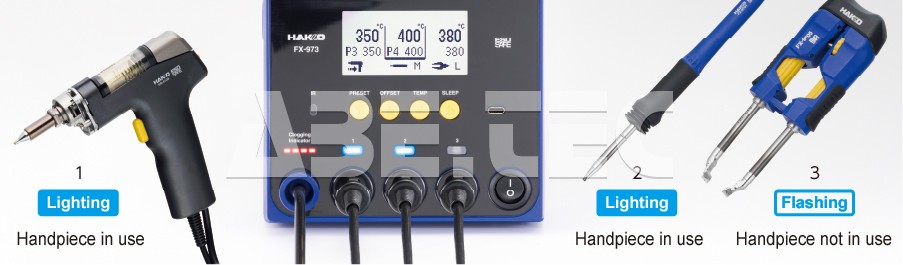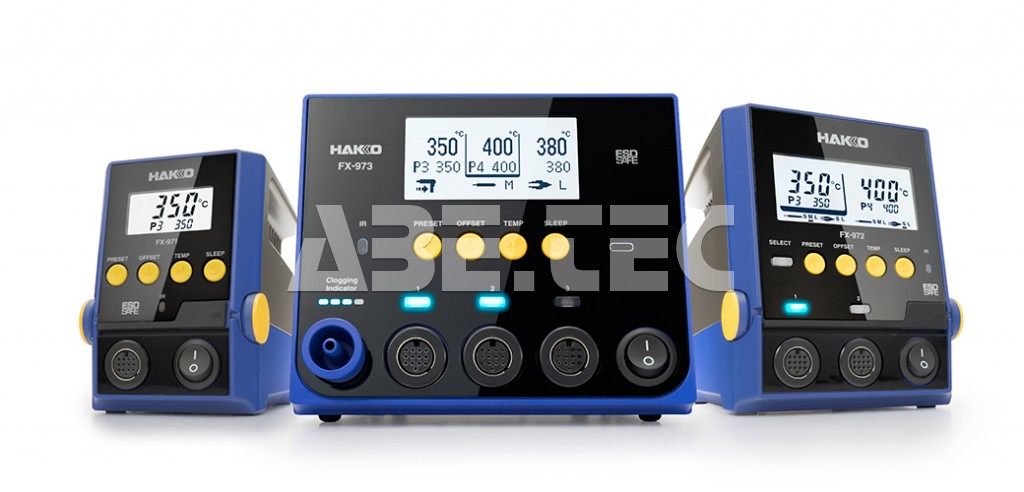 Na jakémkoli portu tříkanálové stanice HAKKO FX-973 lze používat všech devět typů pájecích ruček. Flexibilní možnosti konfigurace umožňují optimální kombinaci a splnění požadavků různých aplikací a vzorků. Standardně je součástí dodávky i odpájecí pistole.