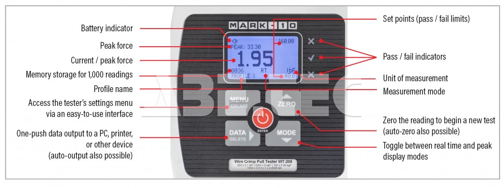 Přenos dat do počítače nebo jiného datového sběrače je možný přes USB, RS-232, Mitutoyo (Digimatic) nebo analogové výstupy. WT-205 ukládá až 1 000 naměřených hodnot a vypočítává statistiky. Po přerušení vzorku může tester automaticky uložit a vygenerovat špičkovou sílu a automaticky se vynulovat v rámci přípravy na další test, čímž se zvyšuje efektivita testování.