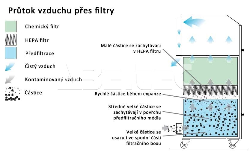 | Účinnost filtrů | předfiltr 95% u částic 0,9 mikrony, kombinovaný filtr 99,997% u částic 0,3 mikrony |