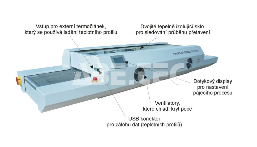 Přetavovací pec je určena pro sřední série desek s plošnými spoji. Vyniká spolehlivost a jednoduchostí obsluhy. Neméně důležitým faktorem je vybavení řidící jednotkou bez nutnosti PC. Nejsou tak žádné starosti Windows, antiviry, atd Ideální pro středni linky na výrobu desek osazených SMD. Pec má velmi spolehlivý systém ohřevu pomocí IR článků. Rozvod horkého vzduchu je zajištěn ventilátory, kde vzduch je řízen speciálními vodiči, které zajišťují rozložení tepla v celém objemu pece. V této kombinaci jde o plnou konvekci ohřevu.