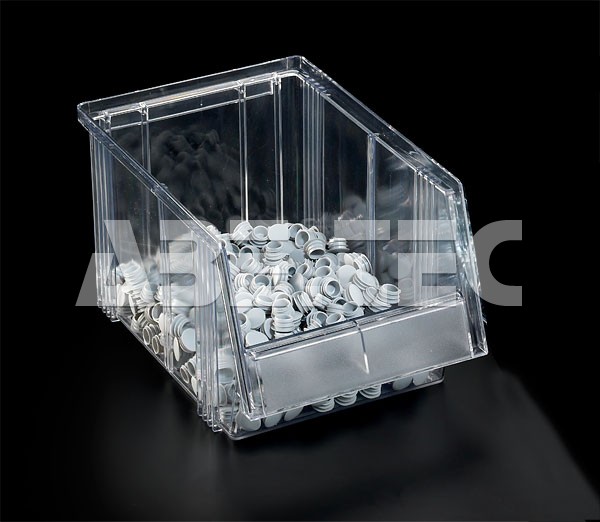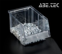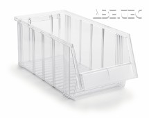 Stohovací zásobník navržený pro usnadnění skladování. Otevřená přední část umožňuje snadný přístup a vlnité dno sběr malých součástek. Rozměry zásobníku 400 x 186 x 156 mm, barva transparentní.