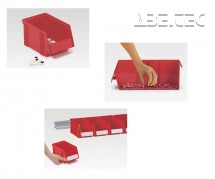 - Stohovací zásobník je vhodný pro stojany, vozíky, kolejnice, stolní stojany, standardní metrické police a části skladovacích systémů.
