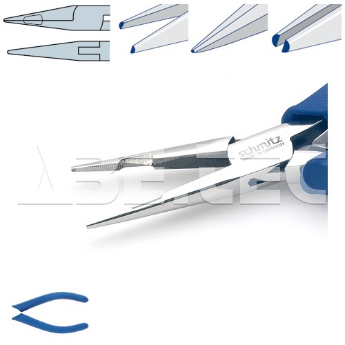 Skřipcové, přidržovací a ohýbací kleště v různých délkách, s různými rukojeťmi, velikostmi špiček, čelisti rovné nebo zahnuté, uvnitř hladké nebo zobkované. Kleště Schmitz jsou všestrannými pomocníky v elektronice a přesném strojírenství.