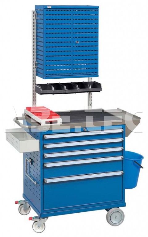 - Průmyslový vozík se zásuvkami a gumovou podložkou.