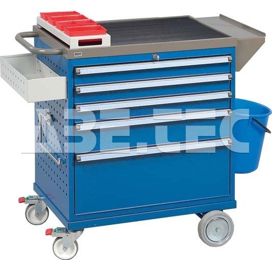 Servisní vozíky Service Trolley jsou vybaveny zásuvkami a bezpečnostním zamykacím systémem. Aby nedošlo k převrácení vozíku, můžete tedy otevřít v jeden okamžik pouze jednu zásuvku, ostatní jsou uzamčeny. Kryt je standardně dodáván s vyjímatelnou gumovou podložkou, která zabraňuje klouzání předmětů na povrchu vozíku. Obě strany mají standardní děrované panely, které můžete použít pro doplňky a příslušenství.