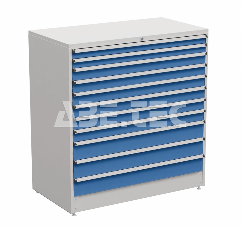 Centrálně uzamykatelké zásuvkové jednotky z vysoce kvalitní oceli nabízí prostor pro skladování nástrojů a malých součástek. Zásuvkové skříňky jsou pokryty epoxidovou ochrannou vrstvou, centrálním zamykáním a úchytkou z eloxovaného hliníku po celé šířce zásuvky. Hladké a tiché teleskopické kuličkové výsuvy poskytují snadné otevření.