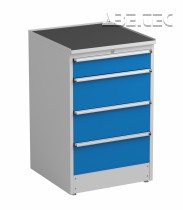 Centrálně uzamykatelké zásuvkové jednotky z vysoce kvalitní oceli nabízí prostor pro skladování nástrojů a malých součástek. Montují se pomocí držáků pod desku stolu. K dispozici jsou také verze s kolečky či soklem. Zásuvkové skříňky jsou pokryty epoxidovou ochrannou vrstvou, centrálním zamykáním a úchytkou z eloxovaného hliníku po celé šířce zásuvky.