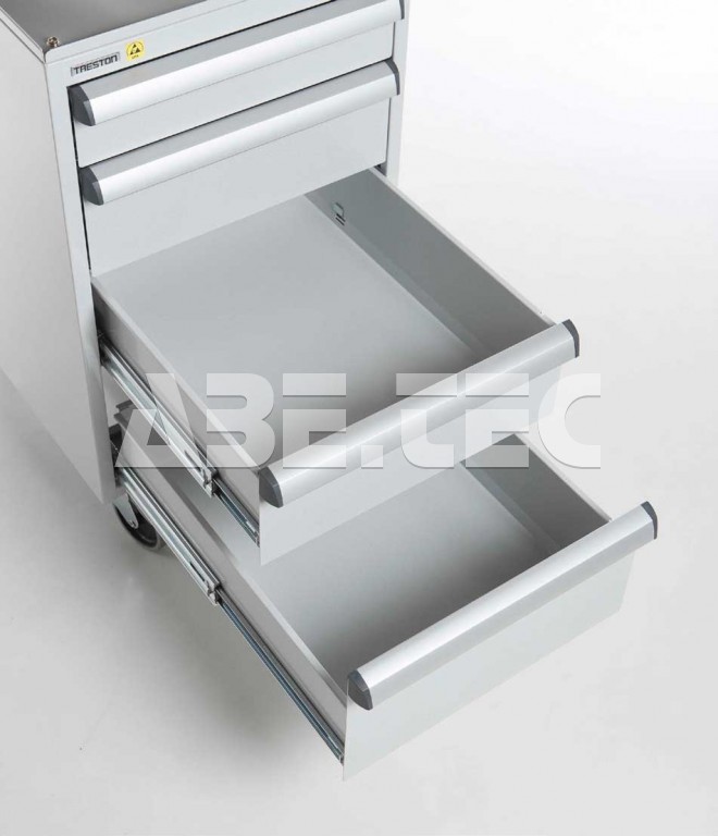 Centrálně uzamykatelké zásuvkové jednotky z vysoce kvalitní oceli nabízí prostor pro skladování nástrojů a malých součástek. Montují se pomocí držáků pod desku stolu. K dispozici jsou také verze s kolečky či soklem. Zásuvkové skříňky jsou pokryty epoxidovou ochrannou vrstvou (šedá, RAL 7035), centrálním zamykáním a úchytkou z anodizovaného hliníků po celé šířce zásuvky.